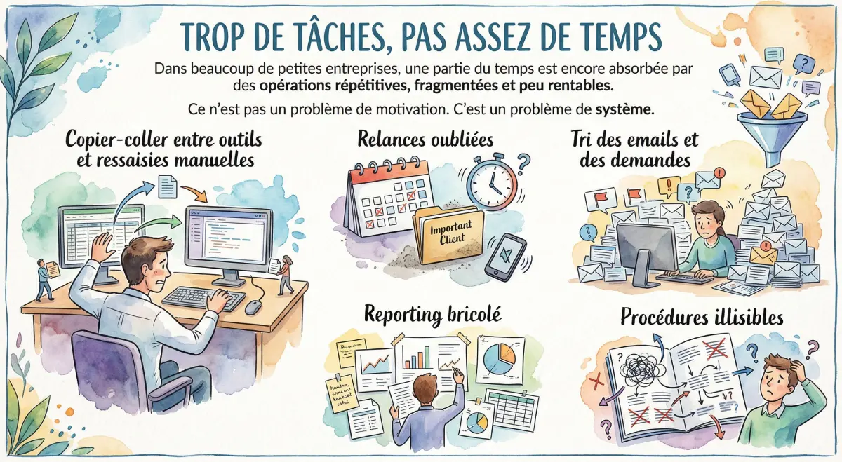 On identifie les tâches répétitives, les points de friction et les pertes de temps.